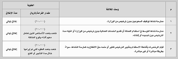 وتغلق المؤسسة بشكل نهائي في حال وظفت سعوديين بدون ترخيص من الوزارة، بالإضافة إلى ممارسة نشاط التوسط في استقدام العمالة أو تقديم الخدمات العمالية دون ترخيص، فضلًا عن قيامها بتأجير التراخيص الممنوحة لها.